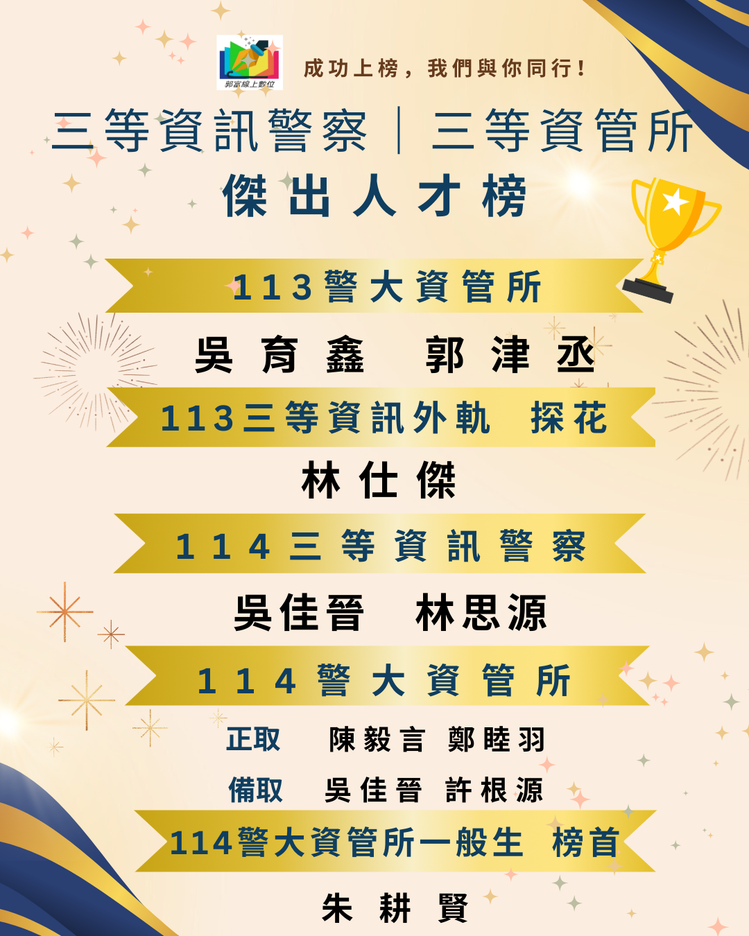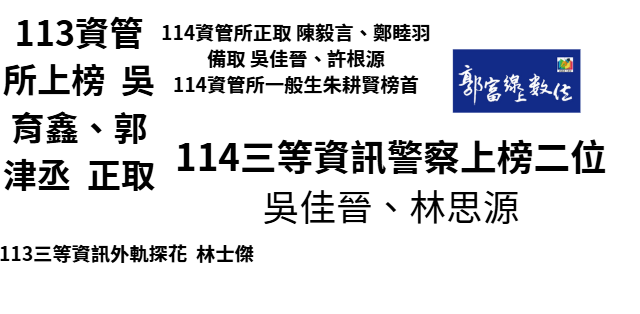 114警大資管所放榜;郭富線上辛苦有代價,雙進攻方案有效果,恭喜上榜學員。115招生中有優惠。114三等大補帖結緣中。上榜5個2備取。
