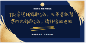 114三等資訊警察plus警大資管所雙進攻雙成就三進攻歡迎加入攻榜[郭富]郭富線上數位[資訊國考][三等資訊警 … 閱讀全文 114三等資訊警察plus警大資管所雙進攻雙成就三進攻歡迎加入攻榜[郭富]郭富線上數位[資訊國考][三等資訊警察][資管所][國安資訊][調查局資訊科學][高普考資訊處理][資通安全][台灣港務]08252025西子灣到此一遊;優惠活動到08312025,填表為限,請把握時間